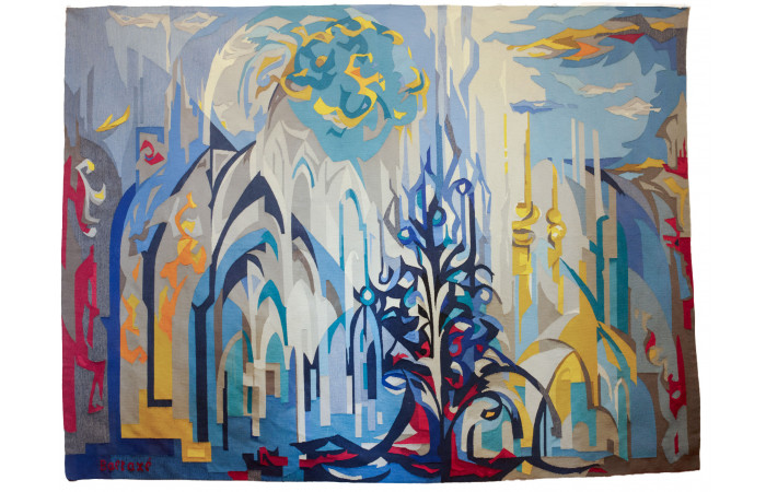 Simone Baltaxé received her artistic education in Paris, first attending the School of Applied Arts before continuing at the École nationale supérieure des Beaux-Arts under the guidance of Jean Souverbie. The disruption caused by the Second World War led her to Lyon, yet her return to the French capital in 1946 reaffirmed her place within the post-war generation of artists who redefined the relationship between modernism and craftsmanship. Her relocation to Lebanon in 1951 marked a decisive transformation in her artistic development. The Mediterranean light and material richness of Beirut infused her practice with a renewed sensitivity that culminated in her engagement with tapestry, following her encounter with the master weaver George Audi in 1964.
