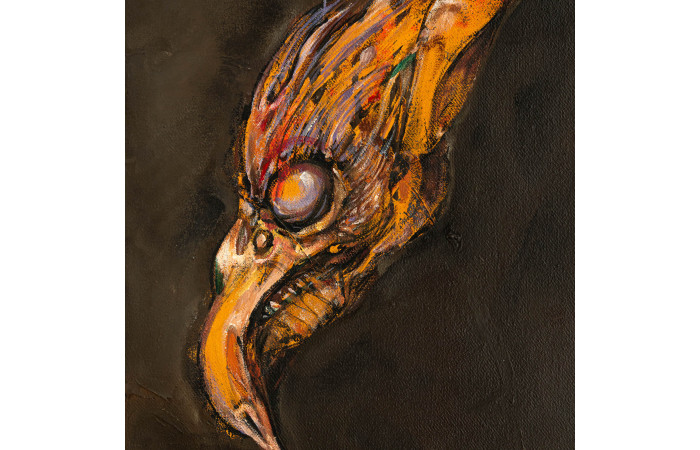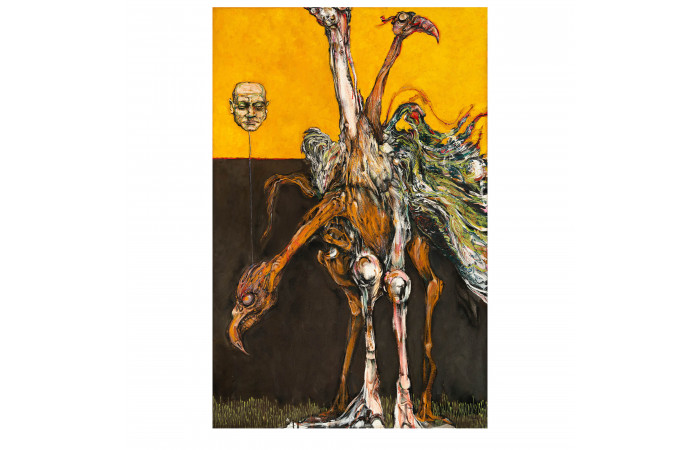 A recurrent feature of his iconography is the presence of zoomorphic motifs and heraldic animals, alongside portraits inclined towards the burlesque and the grotesque. These thematic preferences are supported by a working method that privileges direct engagement with the canvas, the artist declaring that he paints without preparatory sketches. The absence of preliminary drawing does not result in improvisation in the casual sense, but in a controlled unfolding of form, where the balance between narrative suggestion and formal construction remains carefully maintained.