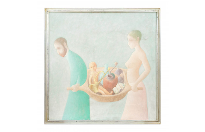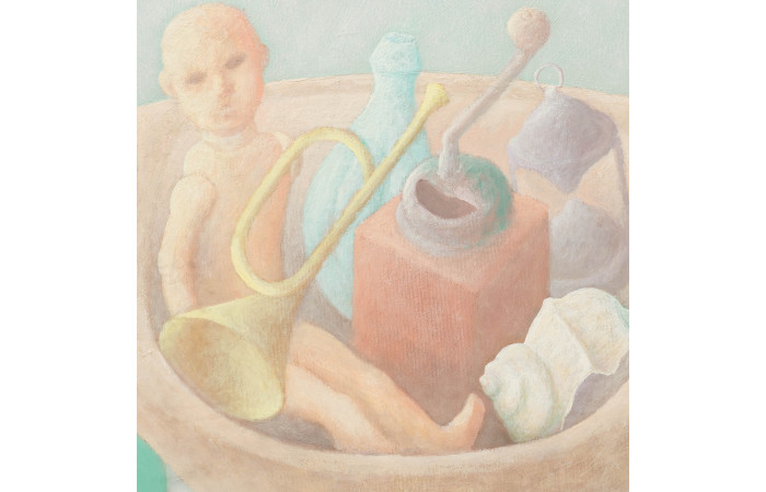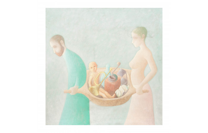Coltofeanu’s figurative painting builds a world of fantasy and subconscious desire in well-defined shapes and soft pastel color palettes. Inviting a sense of quiet reverie, he reflects–with a lyrical tone and in balanced compositions–on themes such as the nude body, religion, nature, temporality, and childhood memories.