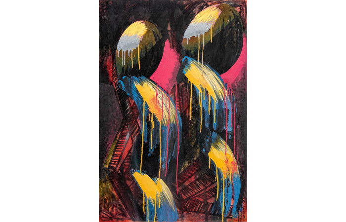 For a number of years, Gorzo has conducted a studio-project called The Continuous Studio, in which people can visit and talk to him while he engages all the visual tools at hand, including the particular space, towards a feverish creation. Surface materiality resonates through the plane of his paintings, revealing their visual and tactile disposition. Evoking traces of De Kooning, Kippenberger, and even Picasso, Gorzo’s Heads, an extensive series by the artist, permeate a world of emotions, shapes, primitive creatures, fairy tales, apparitions. Their visual lexicon is recirculated as a flow of stories told by the artist with insight and careful observation of material and form. Sharp corners and edges become faces, with enhanced or modified traits that oscillate between pure abstraction and variations of expression. These characters scrutinise the world with eyes wide open – carrying the weight of paint, they bring us close to the human condition.