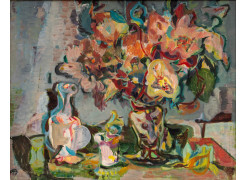 Ligia Macovei was a Romanian painter and graphic artist. She completed her studies at the Belle Arte School in Bucharest under the guidance of esteemed professors such as Cecilia Cuțescu-Storck and Jean Alexandru Steriadi. Macovei’s nonfigurative paintings immerse the viewer in sensitive fluxes of bold and contrasting colors that come together eerily. These expressionist flows evoke a modernist subjectivity, constituted at the electrifying border between the natural and the artificial. Macovei is also known for her portraiture which completes the otherworldly qualities of her painterly universe. Her depictions of human subjects transpose certain characteristics of her illustration work, such as the employment of caricature or more clearly defined lines and contours. Throughout her career, Macovei exhibited her works internationally, for instance at the Venice Biennale in 1956 or at Künstlerhaus Wien in 1965. The artist is equally recognized critically for her illustrations of poetry books by Mihai Eminescu and Tudor Arghezi. Moreover, Macovei and her husband were avid collectors themselves. The couple’s villa, which includes Macovei’s studio and a remarkable survey of Romanian modern art, have been kindly donated to the Bucharest Municipal Museum.