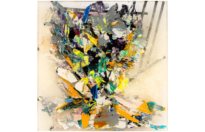 Her work investigates the interplay between transparency and opacity, surface and depth, as a mean of articulating memory and perception. Resin’s capacity to absorb and immobilise other materials allows Aristotel to question the notion of completion in art, presenting each piece as an arrested process. The resulting compositions evoke a material fragility that contrasts with their physical density, inviting the viewer to approach them not as images but as spatial experiences.