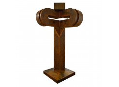 Radu Feldiorean received his formal training at the University of Art and Design in Cluj-Napoca, a background that shaped his sustained presence in contemporary Romanian exhibition practice. His sculptural work relies predominantly on Corten steel and engages a vocabulary of pared-down forms. Series such as Compass, Arca, Aripă în zbor and Epitrahil–Izvorul, presented in exhibitions including Elegii at Elite Art Gallery in Bucharest (2022), illustrate a method concerned with the structural weight of the object and its relation to space. Feldiorean favours volumes that appear both stable and provisional, allowing the material to carry much of the expressive charge while withholding overt narrative intent. His participation in national biennials and in group shows across Bistriţa, Cluj, Sighişoara, Arad and Alba Iulia positions him within the post-1990 generation of Romanian sculptors who test the boundaries between abstraction, symbolic form and the physical behaviour of metal.