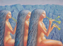 Sabin Bălașa was a famous Romanian visual artist, known especially for his paintings and large scale public murals. During communism, Bălașa was the Ceaușescu couple’s most preferred artist, dedicating numerous works to the ruler and his wife. Whether drawing from socialist themes, reimagining Romanian historical figures or mythological creatures, his works are highly recognizable by the ever-present cosmic blue backgrounds and tones, giving way to hopeful or luxuriant universes to emerge. Many of Bălașa’s paintings imagine fantastic narratives and galactic journeys through space and time, in surreal and eerie landscapes that take as much from science fiction as from Romanian folk tales. The works of Sabin Bălașa have been exhibited in Stockholm, Rome, Moscow, Bucharest, Iași, Tbilisi, Kerkera.