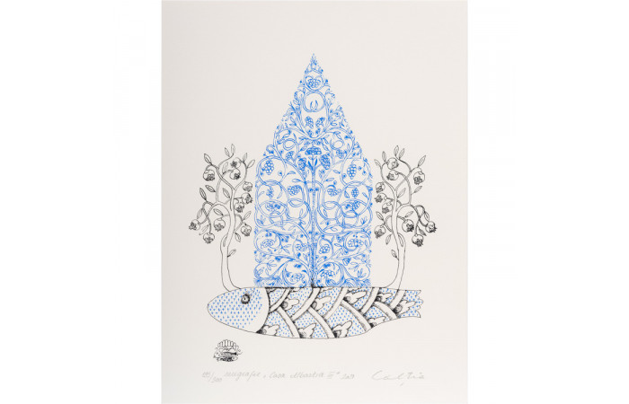 Four sheets belong to the Blue House series, a cycle that examines the dwelling as cultural marker and as reservoir of memory. In these works the house emerges almost organically from the surrounding vegetation, its outlines subtly absorbed by the forms of plants and branches. This integration indicates the artist’s interest in the threshold between the natural environment and the built structure. The controlled relation between the saturated blue façade and the earth-toned framing elements reinforces Câlția’s pursuit of visual balance. Within this configuration the motif functions not as a reference to a specific building but as an image of shelter, continuity and the persistence of place.