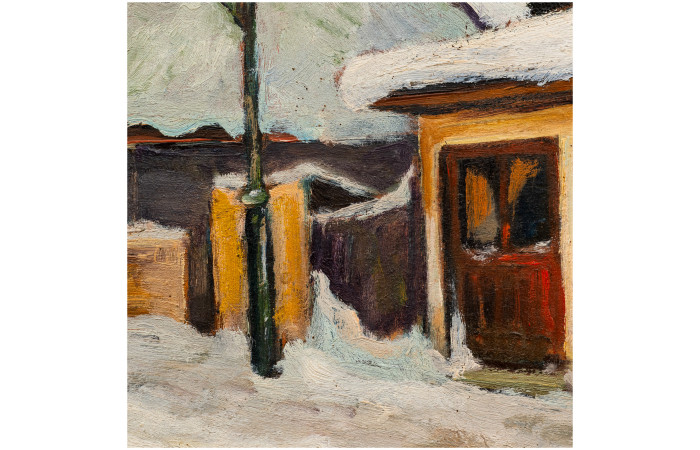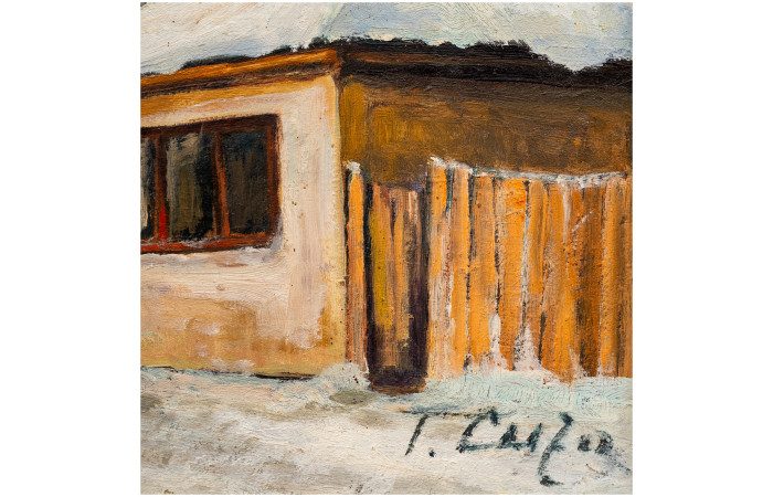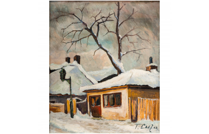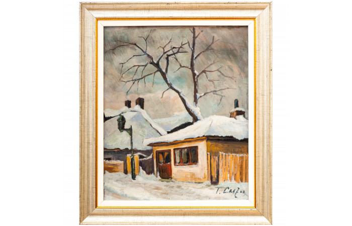 Teodor Cuza’s painting Winter Landscape demonstrates a restrained yet highly refined sensibility for atmospheric transitions and tonal structure. Executed in oil on cardboard, the work captures the muted chromatic register of a frozen rural scene, where light is diffused across a compact, almost tactile surface. Cuza’s brushwork conveys both immediacy and control, avoiding the anecdotal or decorative treatments often found in provincial realism. The spatial rhythm is shaped through the interplay of pale greys, whites, and earthy undertones which articulate the geometry of houses and trees under snow, evoking the stillness and austerity characteristic of the winter motif within Eastern European painting.