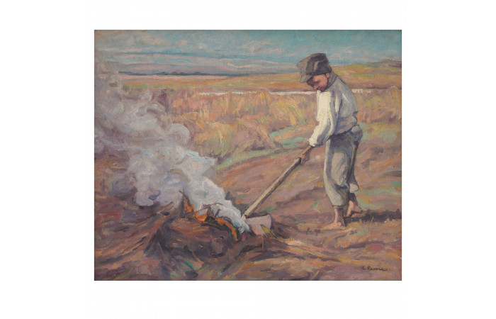 His style emerged through a synthesis of Cézanne’s structural principles - visible in his constructive organisation of form - and the French realist tradition, filtered through a Romanian sensibility. The Romanian peasant became the central figure of his oeuvre, not depicted idly or decoratively but endowed with a solemn, monumental presence, marked by archetypal traits and a sense of ethnic continuity. In works such as Harvesters Resting and Ploughing, man is inseparable from nature, integrated into a balanced and sober universe where stillness and permanence acquire visual significance.