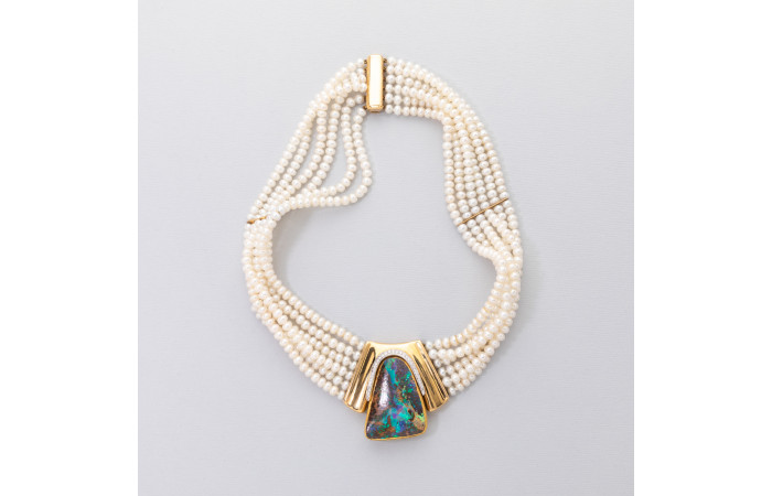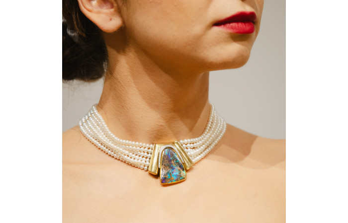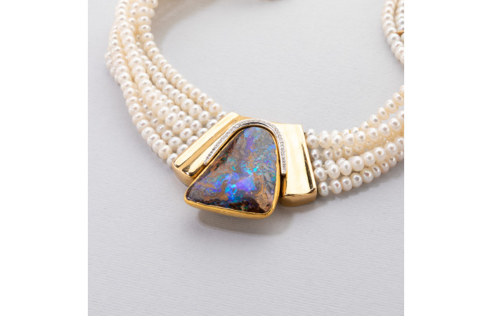 Choker with natural cultured Button pearls and a natural boulder opal pendant