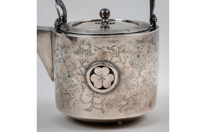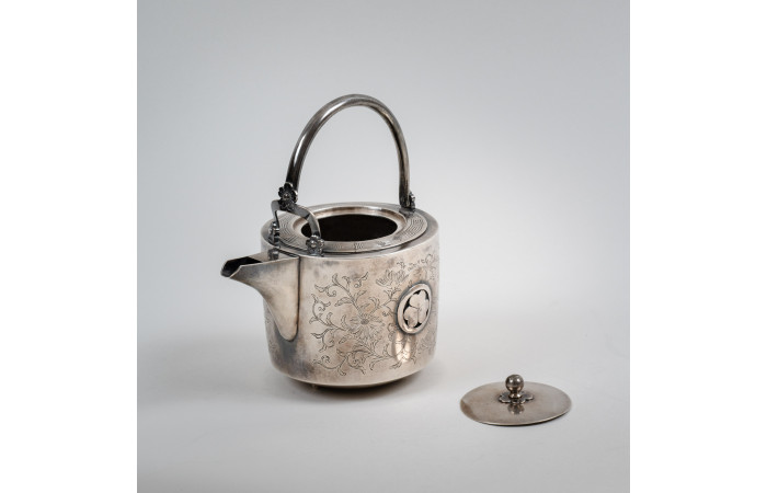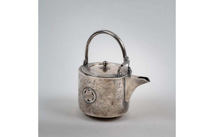 The detachable lid follows the cylindrical contour of the body, consistent with Japanese teapot construction of the Meiji period. The overall design reflects the refined metalwork of late 19th-century Japan, where naturalistic ornament and heraldic emblems are integrated into functional objects.