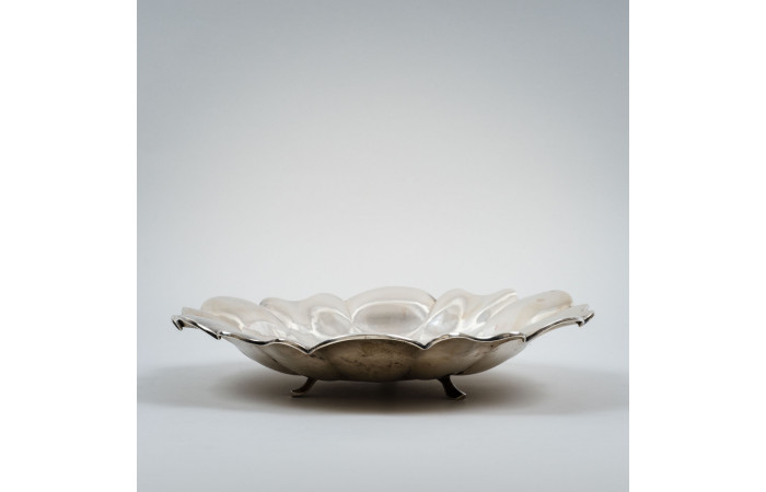A circular, deep fruit bowl with a lobed body and a narrow, strongly pronounced scalloped rim. The central field is left plain, contrasting with the articulated contour of the border. The piece is raised on three small feet, providing both stability and visual elevation.