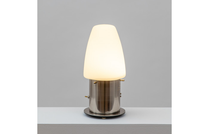 Description: Space Age rocket-shaped table lamp glowing with a soft, ambient light