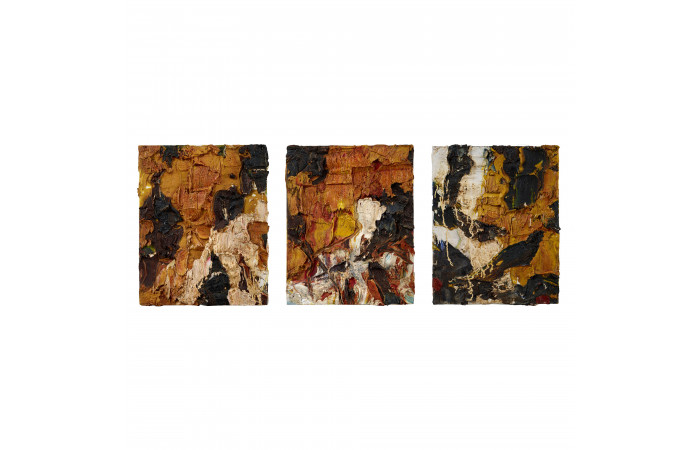In Testimony of Fire (Triptych), Sahmarani translates the phenomenon of combustion into a meditation on transformation and impermanence. The work unfolds as a close focus on an erupting fire, where vibrant yellows collide with the muted patina of decay. Thick impastos form a visceral surface that captures both the intensity of heat and the transient nature of the inferno. Within this visual turbulence, the bushfire becomes a metaphorical dance of destruction — an impostor in its beauty — shifting from the vivid rhythms of life toward the haunting stillness of abstraction. The triptych thus embodies a tension between creation and dissolution, echoing Sahmarani’s enduring preoccupation with the fragile equilibrium between violence and renewal.