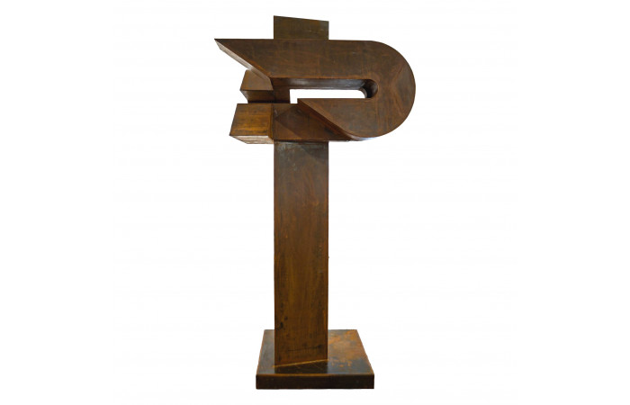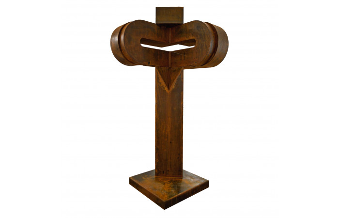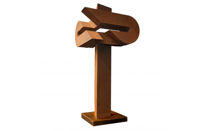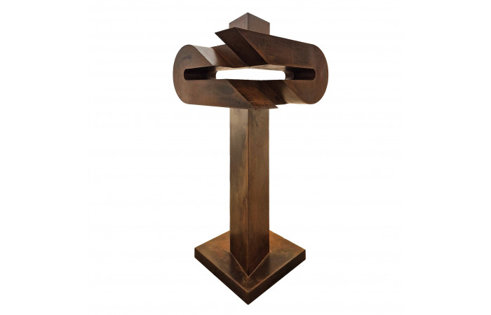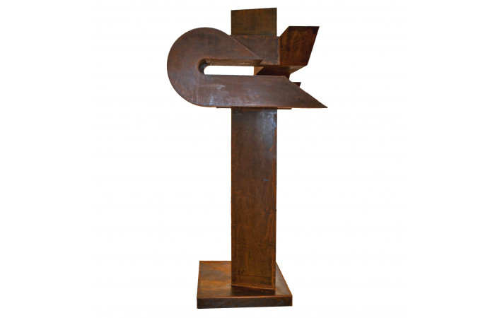 Radu Feldiorean received his formal training at the University of Art and Design in Cluj-Napoca, a background that shaped his sustained presence in contemporary Romanian exhibition practice. His sculptural work relies predominantly on Corten steel and engages a vocabulary of pared-down forms. Series such as Compass, Arca, Aripă în zbor and Epitrahil–Izvorul, presented in exhibitions including Elegii at Elite Art Gallery in Bucharest (2022), illustrate a method concerned with the structural weight of the object and its relation to space. Feldiorean favours volumes that appear both stable and provisional, allowing the material to carry much of the expressive charge while withholding overt narrative intent.