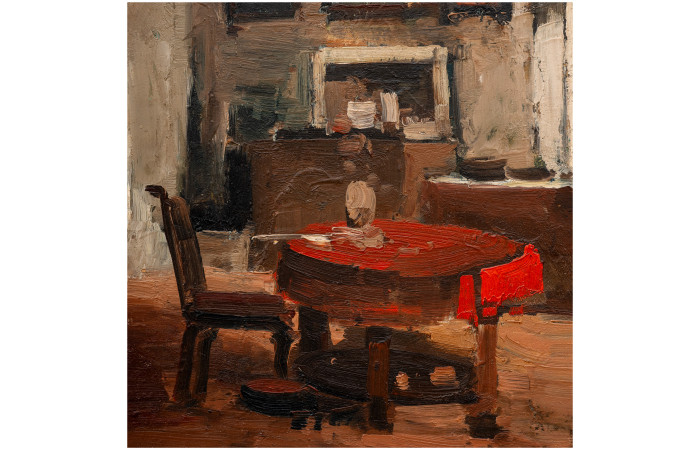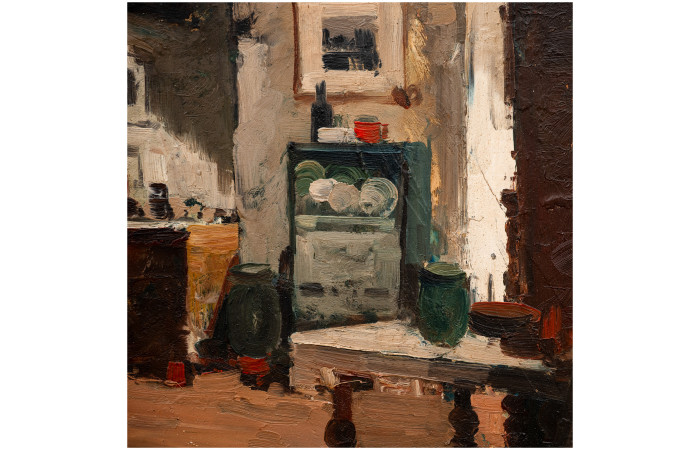 Cheller’s works echo his interest in still nature representations, but also in precarious urban areas, the latter being visible in a series of paintings that capture the quiet landscapes and architectures of Bucharest’s slums. His observant depictions of the streets, houses, and human silhouettes are realised in an expressionist manner, with a wilful use of unbalanced composition in order to achieve an emotionally charged yet realistic depiction of the city’s fringes.
