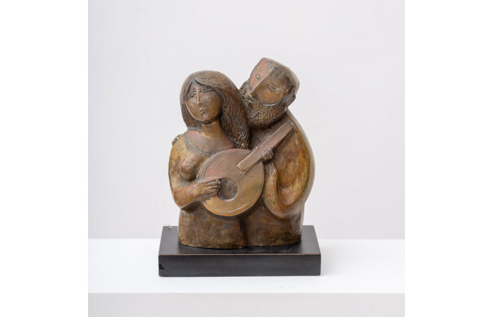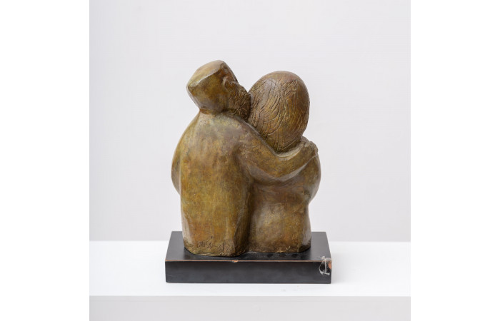 Throughout his career, Briss has combined painting, printmaking, and relief sculpture, often working with mosaic or carved wooden panels integrated into architectural settings. His compositions - built on subdued chromatic harmonies of ochre and blue - feature simplified figures rendered on flat, luminous surfaces, recalling both Byzantine iconography and the stylised innocence of children’s drawings. The hieratic stillness of his characters, anchored in archaic ritual and biblical reference, imbues his work with a quiet spiritual resonance, free from narrative excess.