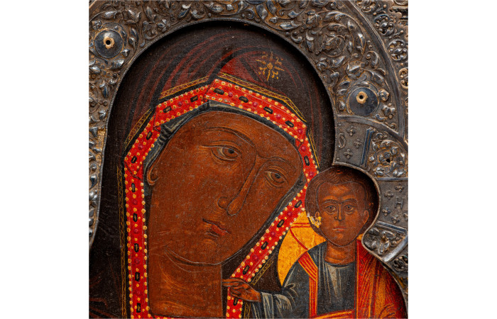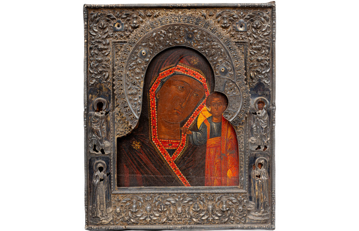 Wooden icon "Virgin Mary with Child (Kazanskaia) and Four Saints" (Icoană pe lemn „Maica Domnului cu Pruncul (Kazanskaia) și patru sfinți”)